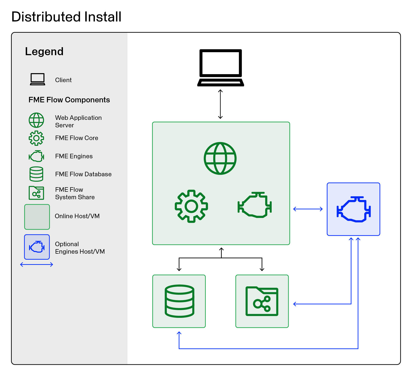 This diagram demonstrates the recommended 2-tier architecture, with the web application server, FME Flow Core, and FME Engines running on the same host, and separate servers for the FME Flow Database and FME Flow System Share. Optionally, you can add FME Engines on a Separate Machine or access Remote Engines Services.