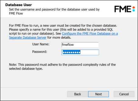 The installation creates a user account under which to use the FME Flow database. Specify a User Name (defaults to fmeflow) and Password for the database user account. Password must not contain any single quote (') characters.