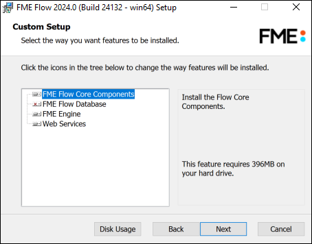 - This option is supported, but not described in Distributing FME Flow Components. Do not select FME Flow Database if you already completed the previous step, Install the FME Flow Database, or if you plan to configure the FME Flow Database on your own database server. If you specify FME Flow Web Application Server under Web Application Server (below), the installation is equivalent to an Express installation.