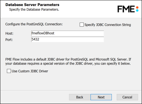 Specify the connection parameters for the FME Flow Database. Optionally, to customize the connection parameters in the JDBC connection string, check Specify JDBC Connection String.
