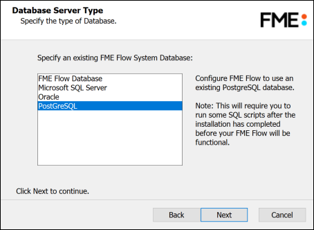Specify the type of database for the FME Flow Database. If you installed, on a separate machine, the PostgreSQL database included with the FME Flow installer, select FME Flow Database. If you are configuring the FME Flow Database on your own database server, select the database server type: Microsoft SQL Server, Oracle, or PostgreSQL. For more information, see Provide a Database Server.