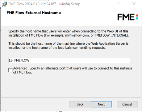 If this FME Flow installation will be available to users outside an internal network (for example, on an external website), specify the external hostname that users will enter when connecting to FME Flow. For example, if you are hosting FME Flow on myfmeflow.com/myfmeflow, enter myfmeflow.com.