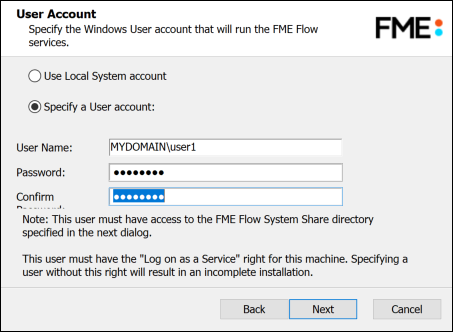 Specify the Windows user account that will run the FME Flow System Services. This account must have:
