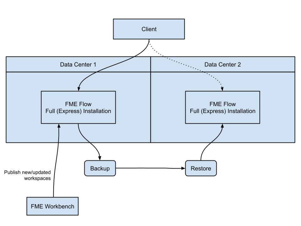 This example of disaster recovery is a combination of an Express installation and a fault-tolerant installation. However, instead of a third-party load balancer between systems, FME Flow clients must be manually redirected to the FME Flow Core host server of the second data center in the event of a disaster. Each data center houses full ("Express") installations of FME Flow, essentially configured to provide similar functionality. To ensure synchronicity of FME Flow system data between data centers, Backup & Restore operations are performed regularly. (Otherwise, workspaces and other updates must be published twice - to the FME Flow Core hosts on each data center.)