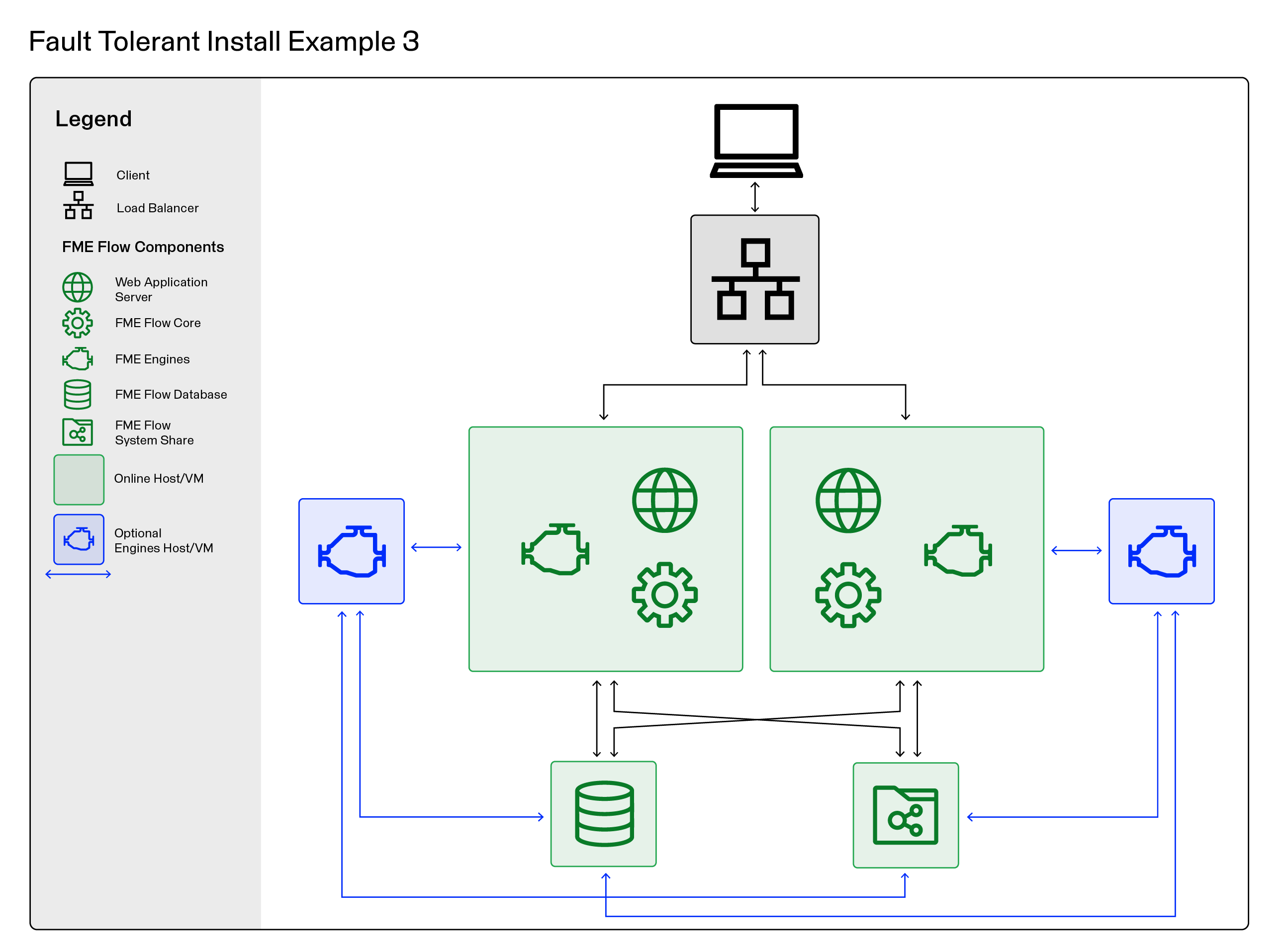 The fault tolerant architecture is comprised of multiple, redundant web application servers (to run the FME Flow Web Services) and FME Flow Cores spread across separate host machines. FME Engines can be hosted on the same machine, across additional hosts on the same network, or across networks.