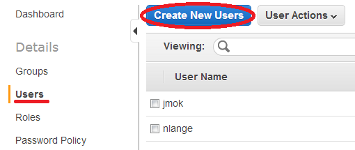 In the IAM Console, select Users from the sidebar and then click Create New Users.