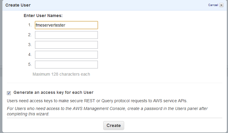 - In the Create user dialog, enter a new user name. Leave Generate an access key for each User checked. Click Create.