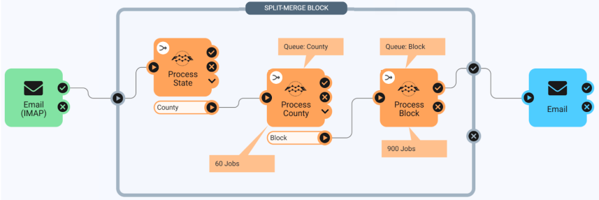 This example sends an email after a set of workspaces completes. A split-merge block receives a message from an Email Received (IMAP) trigger. The block comprises three Run a Workspace actions. Workspace Process State runs one job and outputs county feature type data to workspace Process County. The Run a Workspace action for Process County runs 60 jobs (one for each county), and outputs block feature type data to workspace Process Block, which, in turn, runs 900 jobs (one for each block). The block waits to ensure that all 961 jobs are complete before it outputs a single message to a Send an Email external action.