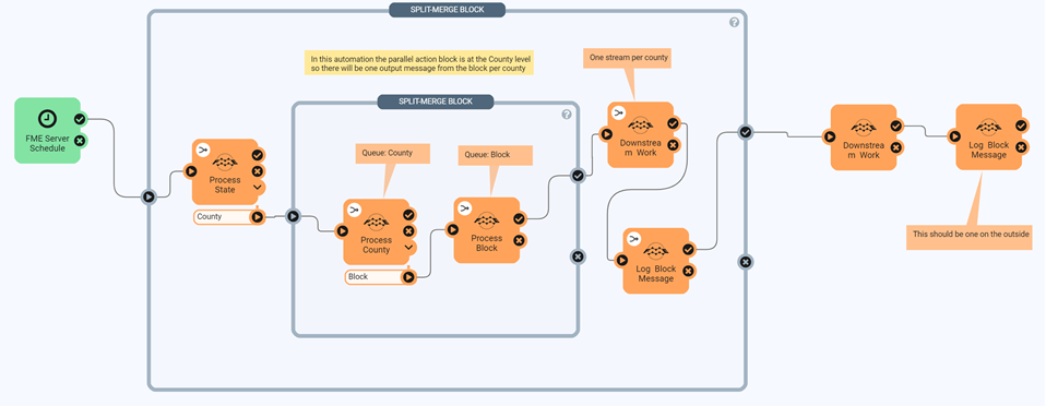 You can nest split-merge blocks inside one another to control the level by which you want to aggregate output messages from workspace actions. This example nests the Process County and Process Block workspaces from the previous example inside another split-merge block that initiates with workspace Process State. By nesting in this manner, messages are aggregated at the county level for processing, rather than the state level, before being output as a single message. The nested split-merge block outputs one message for each county, combining all of a county's block data. Each message is input to the workspace actions in the outer split-merge block for processing. When complete, a single, combined message is output from the outer split-merge block.