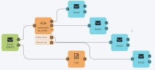 The example below illustrates a simple workflow comprised of a trigger that receives an email, an action to run a workspace, and an array of external actions that sends emails depending on the workspace results. An Email Received (IMAP) trigger sends messages to a Run Workspace action whenever an email from a specified IMAP server host is received. The workspace validates features in a file attached to the email, and reads features that pass validation into a database. The automation proceeds with separate Send an Email external actions based on the results of the validation in the Run Workspace action. One email sends details about features that passed validation and were read into the database, including details on feature type attributes. Another email sends details about features that failed validation. As well, two additional emails are sent depending on whether the workspace completed successfully or not. Finally, metadata about any Email Received triggers that fail to fetch emails is logged.