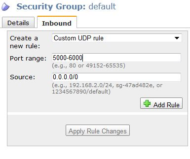 When specific ports are desired, the port should be made available and not blocked by firewall settings. In the following example, Amazon Web Services firewall security settings are configured for an instance to reserve ports 5000 - 6000 (incoming) for the UDP trigger: