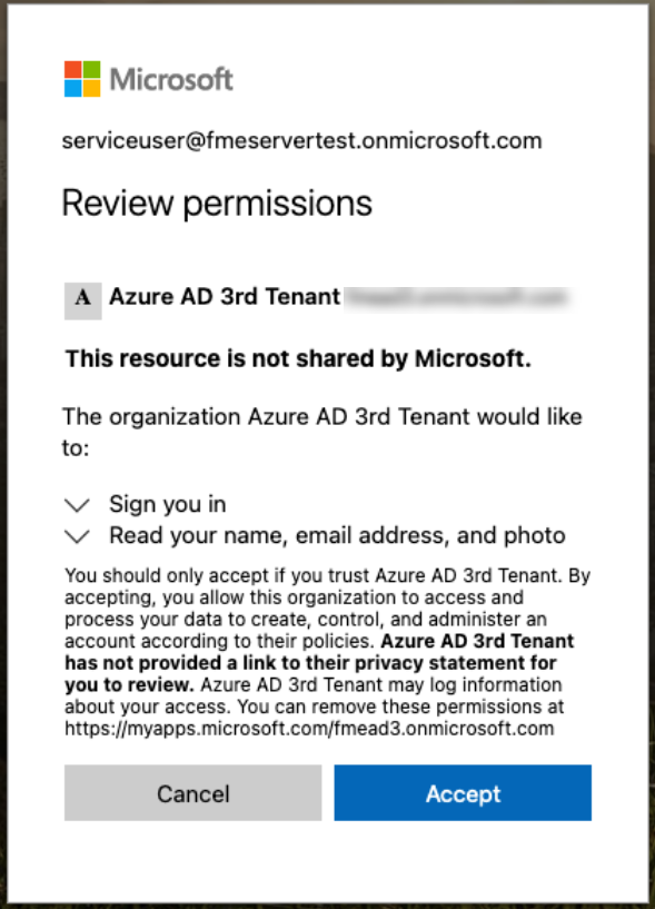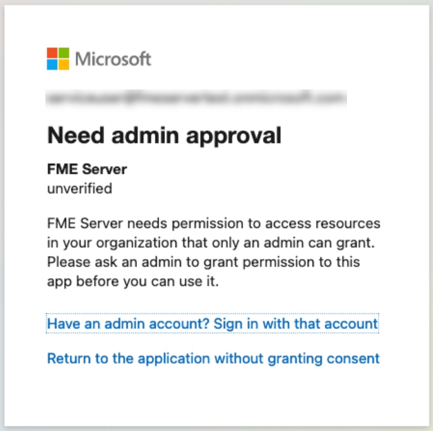 - Navigate to https://login.microsoftonline.com/<tenantId>/adminconsent?client_id=<clientId>, where <tenantId> is the secondary tenant ID and <clientId> is the FME Flow Application (client) ID.